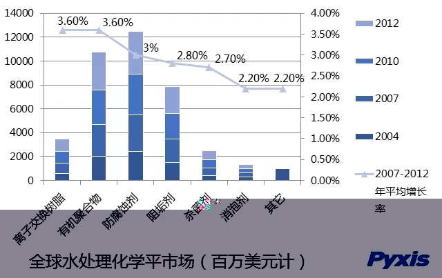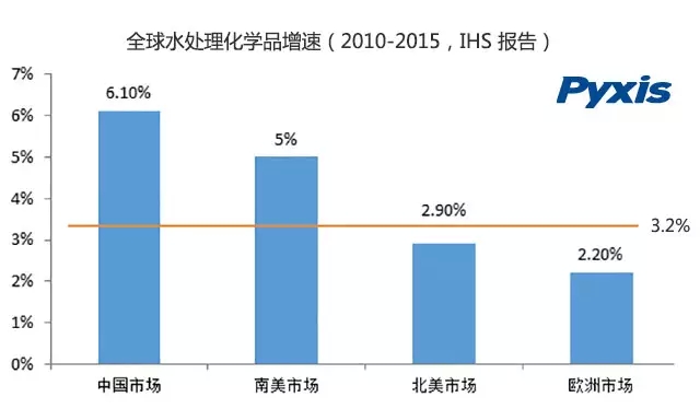 IHS化學公司日前的分析印證了這一點。其發(fā)布報告稱,2010~2015年,全球水處理化學品消費量將以年均3.2%速度增長,市場規(guī)模將達約1240億美元。其中,中國市場年均需、求增速約為6.1%,南美增速預計為5%,北美增速約為2.9%,歐洲增速約為2.2%。