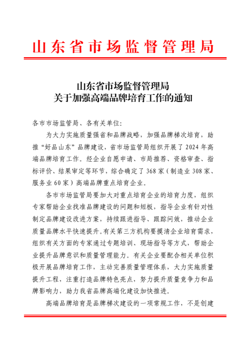 近日,山東省市場監(jiān)管局公布了2024年度山東省高端品牌培育企業(yè)名單,我公司憑借出色的品牌實(shí)力與市場競爭力,成功脫穎而出,榮耀入選。